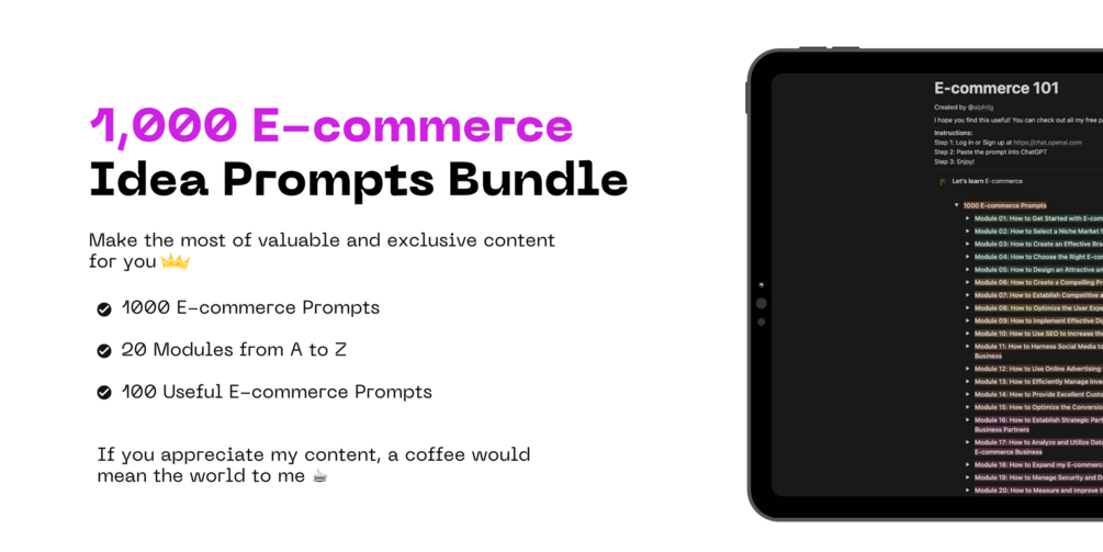 - The Ultimate Collection of 1000 E-commerce Prompts is here to help you take control of your E-commerce operations and transform the way you work.